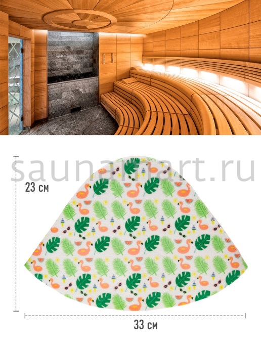 Шапка это необходимый атрибут для похода в баню или сауну. Высокая температура и сухой воздух в парной могут вызвать перегрев и ожоги кожи головы. Шапка для бани убережет голову, уши и волосы от высокой температуры и перегрева. Если пренебрегать защитой головы с помощью шапочки, то волосы теряют влагу и становятся ломкими и сухими. Помимо термоизоляционных свойств банная шапка обладает отличными гигроскопичными свойствами - прекрасно впитывает влагу и пот, что сделает Ваше пребывание в парной более комфортным. Головной убор для бани выполнен из натурального материала – войлок. Материал достаточно пористый, за счет чего создает своеобразный защитный барьер по принципу термоса, для изоляции от высокой температуры. Стильный, яркий, необычный рисунок выделит Вас и подчеркнет Вашу индивидуальность. После применения расправьте шапку и просушите. Размер универсальный. Мы предлагаем Вам не только эффективное средство защиты от перегрева, но и стильный яркий аксессуар для бани и сауны.