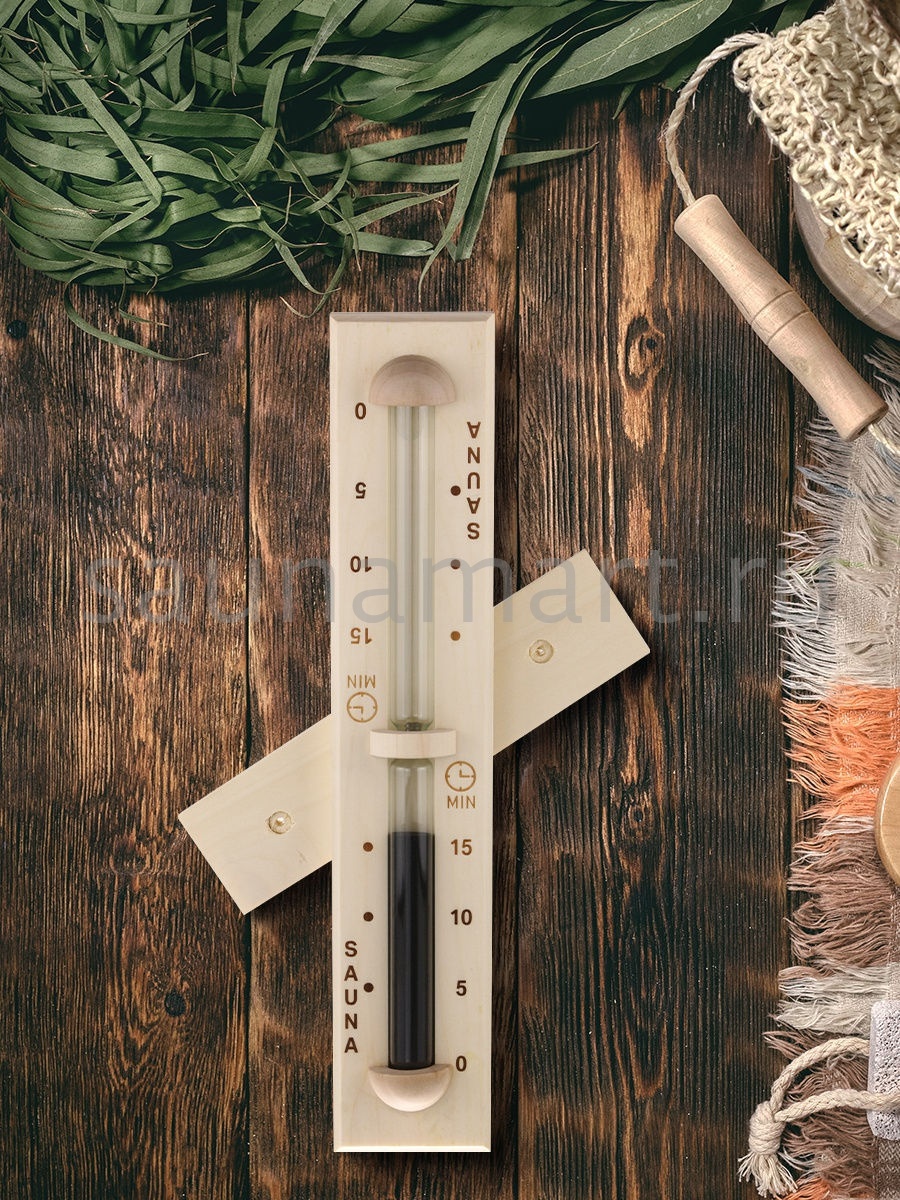 На корпус из натуральной древесины осины нанесена графичная временная шкала. Так, что вам легко будет отслеживать свой индивидуальный режим парения. Колба с песком выполнена из жаропрочного стекла, внутри засыпан цветной песок, для лучшего обзора. Прибор не боится высокой влажности и температуры, поэтому идеально подходит для использования внутри парной. Размер изделия: 34 * 6,5 * 3 см.