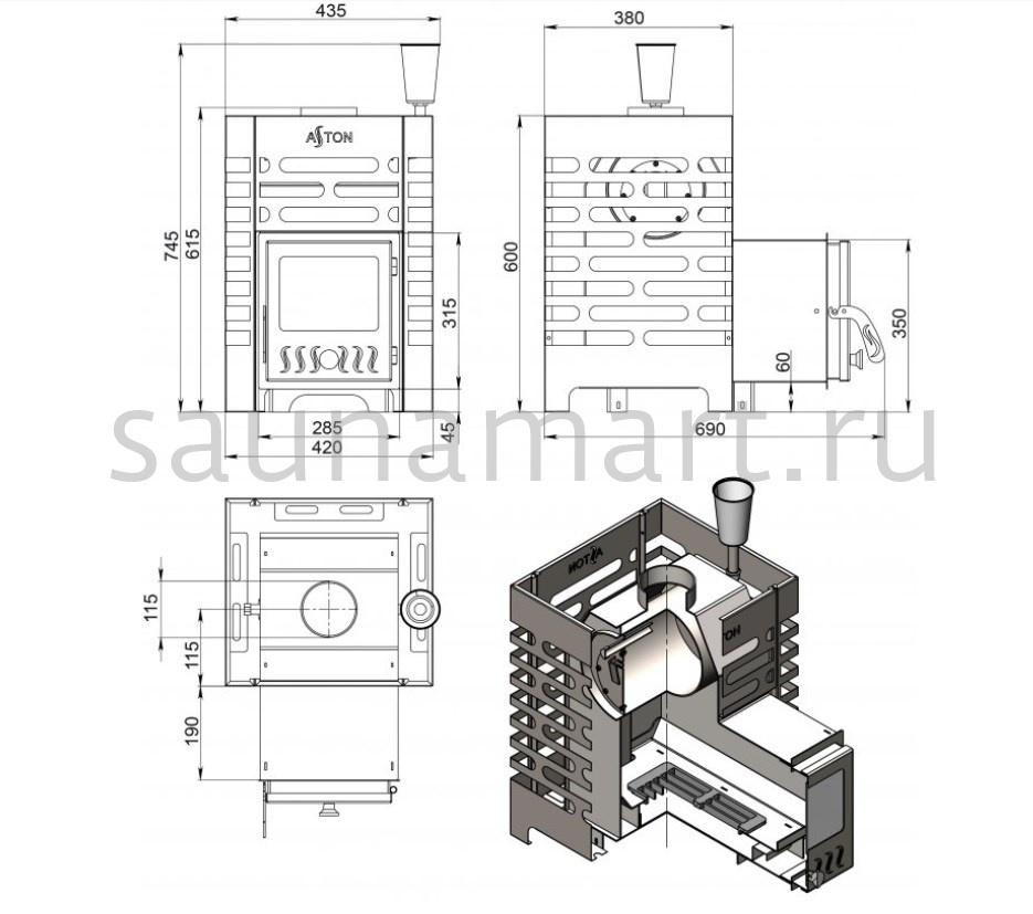 Преимущество печей ASTON: Конструкция разработана для максимальной тепловой эффективности при минимальном расходе ресурсов - времени и топлива. Каменка и корпус имеют скошенные поверхности, что обеспечивает свободное движение дымовых газов без образования "дымовых карманов". Такая геометрия позволяет всем частям печи прогреваться равномерно как по температуре, так и по времени, обеспечивая полное сгорание топлива и быстрый результат.