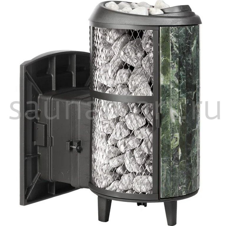 Модель с комбинированной облицовкой из нержавеющей сетки и ламелей. Особенность модели - открывающаяся дверь с ламелями. Это оригинальное решение обеспечивает быстрый прогрев парной.
