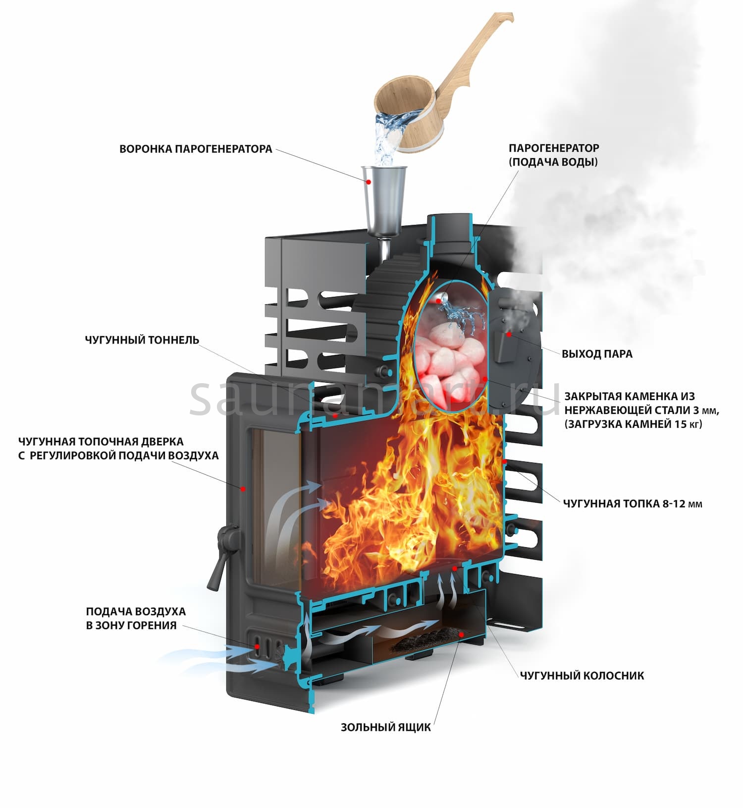 - Материал закрытой каменки: нержавеющая сталь AISI 430