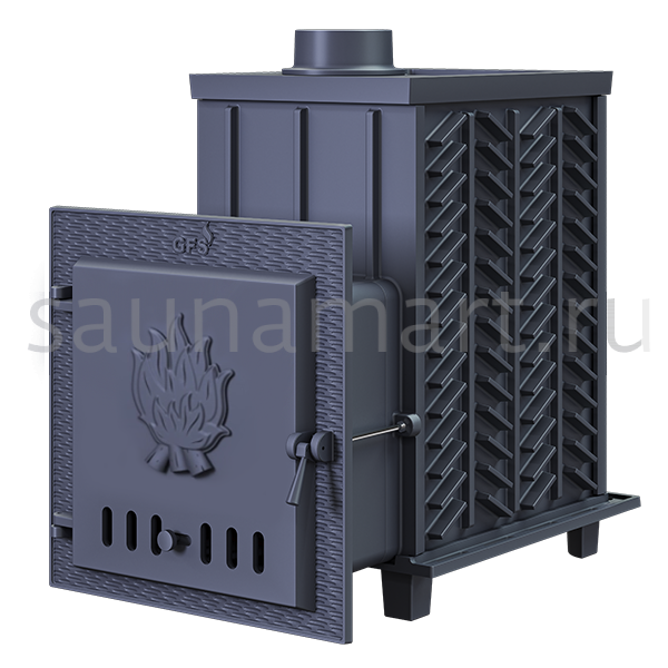 GFS-ЗК 25 — это печь с усиленной каменкой большей массы, с единым углублением внутрь топки для дополнительной укладки чугунного заряда. Теплосъемные шипы, со стороны горения пламени, в разы увеличивают площадь соприкосновения огня с каменкой и ускоряют передачу тепла, а также способствуют лучшему дожигу, смешивая потоки пламени и воздуха, поступающего из воздушника. Эти усовершенствования значительно повышают мощность парообразования печи и выдают большее количество пара при непрерывной подаче воды. Каменка печей GFS-ЗК является незаливаемой.