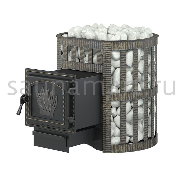 Банная чугунная печь Легенда Ковка 12 (261) укомплектована чугунной герметичной дверцей Везувий 261. Конвекционно-вентилируемый кожух "Ковка" изготовлен из металлической текстурированной полосы, покрашенной термостойкой краской и покрытой патиной «Бронза».