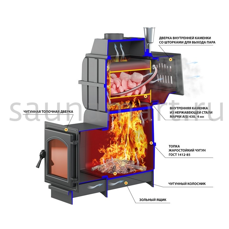 Стальная банная печь ВЕЗУВИЙ Скиф с закрытой каменкой Стандарт (ДТ-3) 2022 предназначена для прогрева парного помещения в бане и поддержания необходимой температуры во время парения. Печь СКИФ оборудована открытой каменкой, закладываемой камнями для бани (приобретаются отдельно). Печь изготовлена из особо прочной котловой стали 09Г2С, рассчитанной на работу при высоких температурах и давлении. Толщина стенок печи составляет 4-6 мм. Топочный тоннель также выполнен из стали марки 09Г2С толщиной 4 мм, что позволяет топить дрова длиной более 50 см. Топка оснащена каналом для подачи воздуха на вторичный дожиг дымовых газов. Канал проходит по задней стенке топки снизу вверх и подаёт воздух для горения в верхние отделы топки. Такая конструкция повышает экономичность печи и увеличивает КПД агрегата.