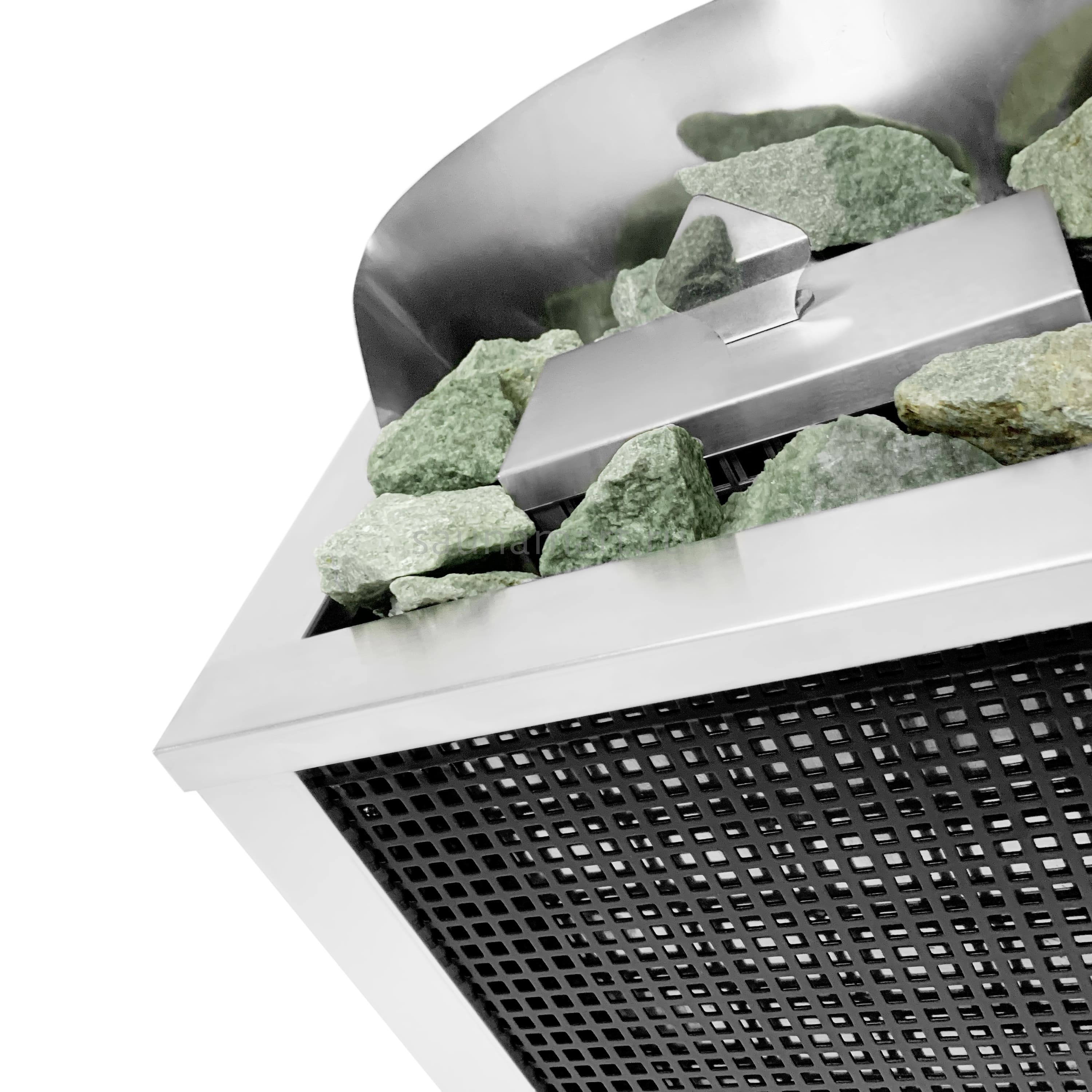 При достижении показателя заданной температуры, электрокаменка полностью не отключается, а работает на постоянной основе в 50% от максимальной мощности, чтобы камни в печи всегда были горячие и давали пар. В отличии от любых аналогов (где печь отключается целиком, и камни становятся холодные). При понижении температуры в парной на 2-3 ? от заданной, вторые 50% мощности подключаются, и каменка начинает работать в полную мощность.