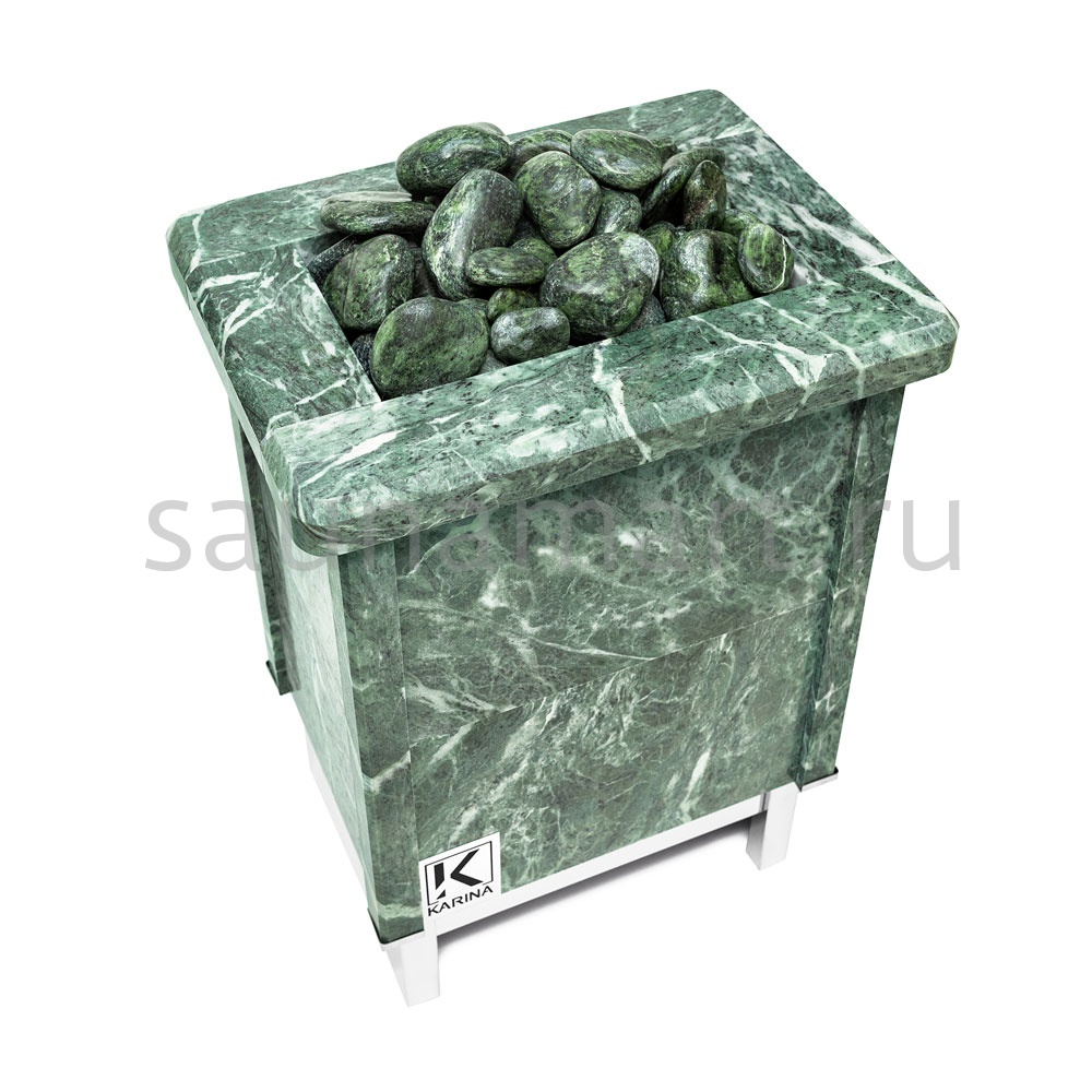 Электрическая каменка со всех сторон облицована натуральным змеевиком. Печь с подобным дизайном стильно смотрится в парильном помещении. Змеевик уже долгие годы используется для внутренней отделки бань. Его называют «аптекарским камнем» за его целебные качества. Минерал оказывает обеззараживающий эффект, положительно влияет на кости, оказывает успокаивающее воздействие и укрепляет иммунитет.