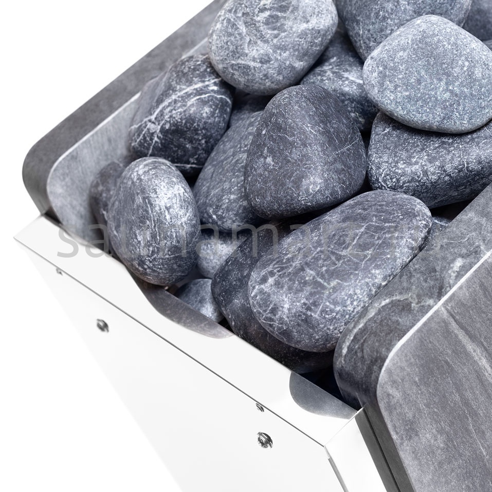 Простые формы каменки выгодно подчеркнуты 4 вертикальными камнями талькохлорита, которыми облицованы передняя и задняя стенки печи. Материал боковых стенок представляет собой высококачественная нержавеющая сталь, защищающая все внутренние элементы прибора от влаги, температурных перепадов и коррозии.