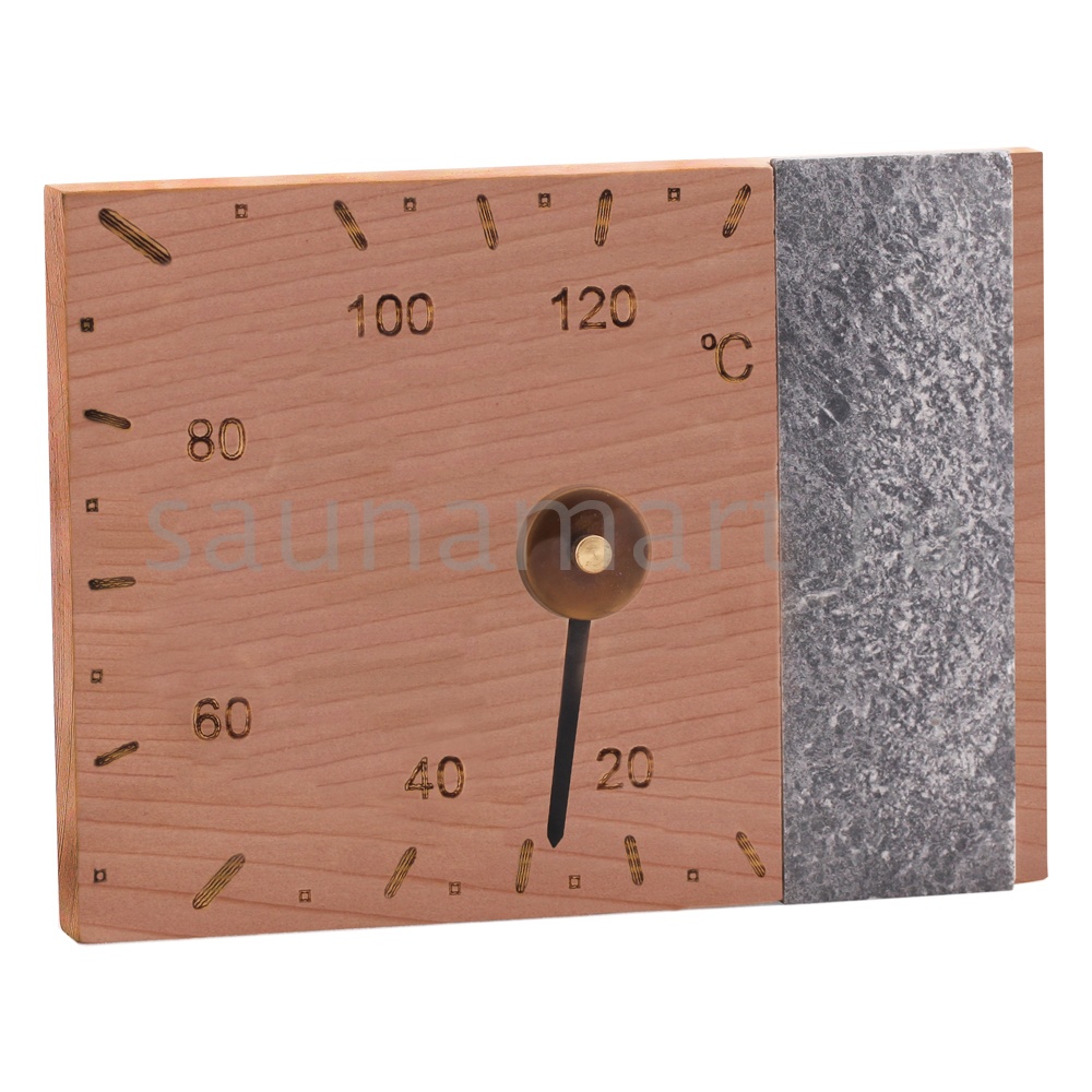Гигрометр прямоугольной формы со вставкой из талькохлоритного камня фирмы Sawo, выполненный из кедра, позволит измерить влажность воздуха в вашей парилке.