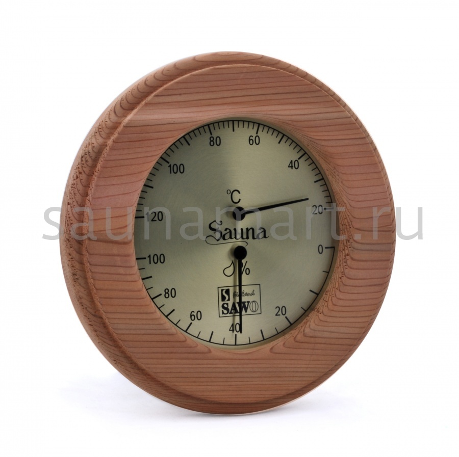 Термогигрометр SAWO 231-ТНD отличается надежностью, долговечностью и практичностью. Корпус прибора выполнен из кедра, очень прочного материала, который не выделяет смолы. Диаметр 18,5 см. В широкой раме из кедра находится круглый циферблат, под термостойким стеклом, разделенный на 2 шкалы. Градуировка шкалы гигрометра варьируется в пределах от 0 до 100 %. Градуировка шкалы термометра варьируется в пределах от 0 до 120 градусов по Цельсию. Предусмотрена возможность калибровки прибора. Термогигрометр SAWO прекрасно впишется в интерьер любой бани или сауны и удачно дополнит интерьер. Термогигрометр Саво подойдет для использования в любом парильном помещении, как в условиях русской бани, финской сауны так и хамама. Помните, чтобы проведённое в парной время оказало благоприятный эффект на здоровье и самочувствие, необходимо тщательно соблюдать температурный режим парения и режим влажности. Высокий стандарт качества SAWO гарантирует надёжность и точность измерений термо-гигрометра.
