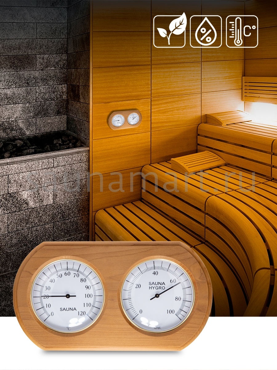 Термогигрометр это комбинированный прибор для измерения температуры и влажности в парной. В лаконичной, овальной, широкой рамке из термо древесины липы находятся два больших, круглых циферблата. Один циферблат - это гигрометр, который с точностью измерит уровень влажности в парной, другой циферблат - термометр, который сообщит о температуре воздуха. Данный прибор прекрасно подойдёт для использования в парной. Благодаря универсальному дизайну он станет прекрасным дополнением любого интерьера. Наш термогигрометр для бани и сауны соответствует всем требованиям для данных приборов - оснащен не сильно нагревающимся корпусом и способен выдерживать перепады температуры и влажности. Размер термогигрометра 24,7х13,6х3,4 см.