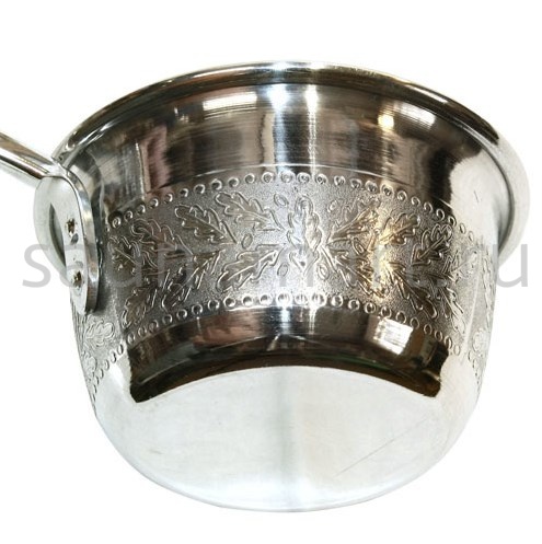 Небольшой универсальный черпак подойдет для забора воды из различных ёмкостей, им удобно подливать кипяток в шайку или купель, а также использовать для поддачи пара — длинная ручка поможет в этом случае избежать ожога горячим паром. Металлический черпак украшен рельефным тисненым узором, который придаёт изделию индивидуальность и привлекательный внешний вид.