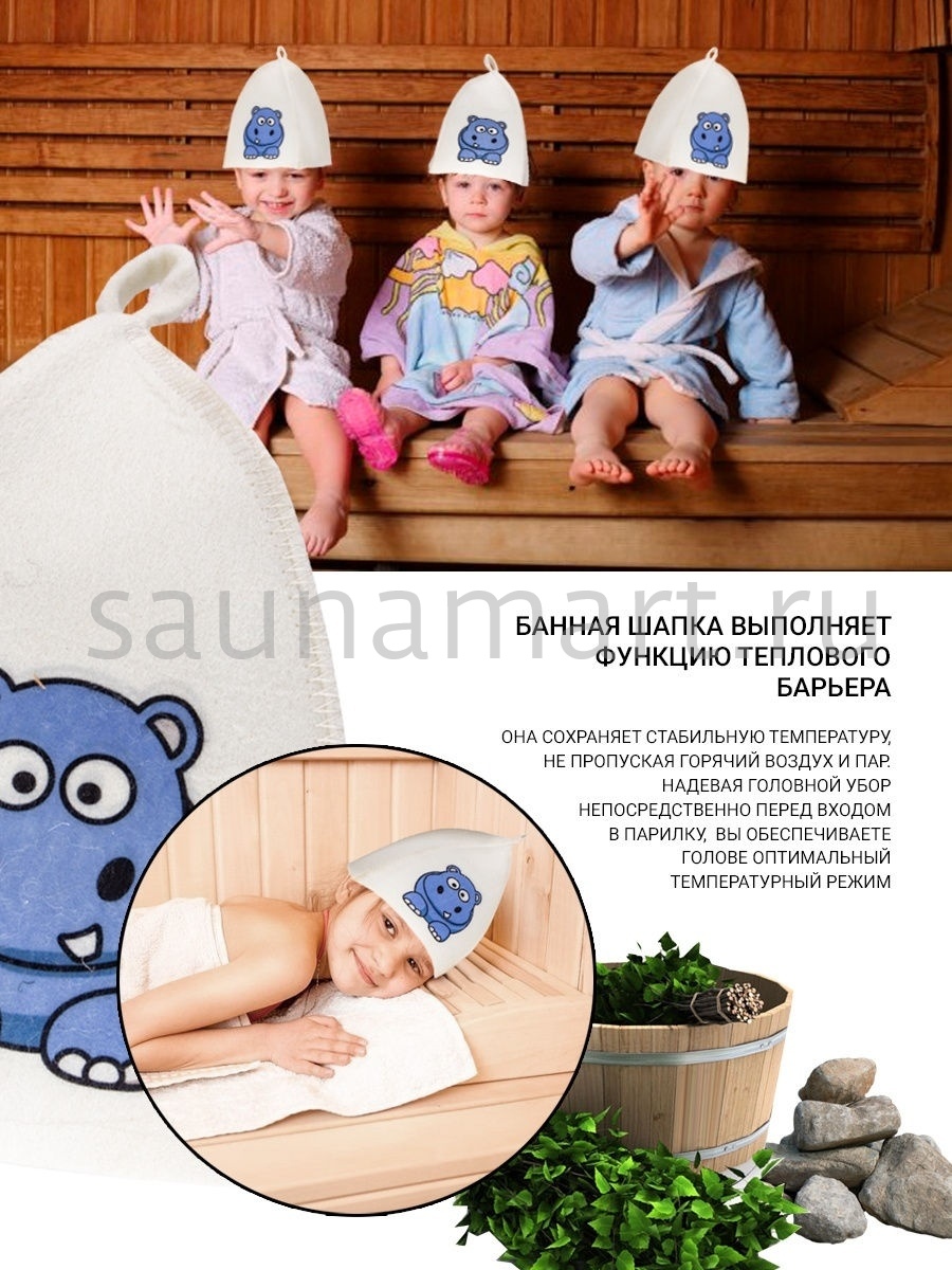 Шапка это необходимый атрибут для похода в баню или сауну – как для взрослых, так и для детей. Высокая температура и сухой воздух в парной могут вызвать перегрев и ожоги кожи головы. Шапка для бани убережет голову, уши и волосы от высокой температуры и перегрева. Если пренебрегать защитой головы с помощью шапочки, то волосы теряют влагу и становятся ломкими и сухими. Помимо термоизоляционных свойств банная шапка обладает отличными гигроскопичными свойствами - прекрасно впитывает влагу и пот, что сделает Ваше пребывание в парной более комфортным. Головной убор для бани выполнен из натурального материала – войлок. Материал достаточно пористый, за счет чего создает своеобразный защитный барьер  по принципу термоса, для изоляции от высокой температуры. Яркий рисунок бегемотика обязательно придется по вкусу ребенку. После применения расправьте шапку и просушите. Мы предлагаем Вам не только эффективное  средство защиты от перегрева, но и стильный яркий аксессуар для бани и сауны.
