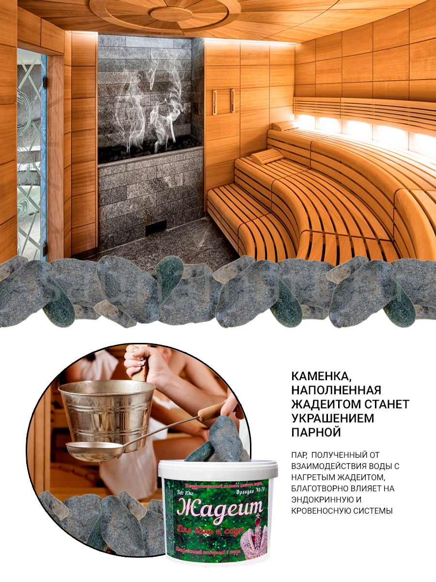 Благодаря своей плотной структуре, жадеитовые камни отличаются длительным сроком службы. Колотые камни прекрасно подходят для заполнения резервуара печи в сауне. Шероховатая поверхность камней гарантирует более активное парообразование.